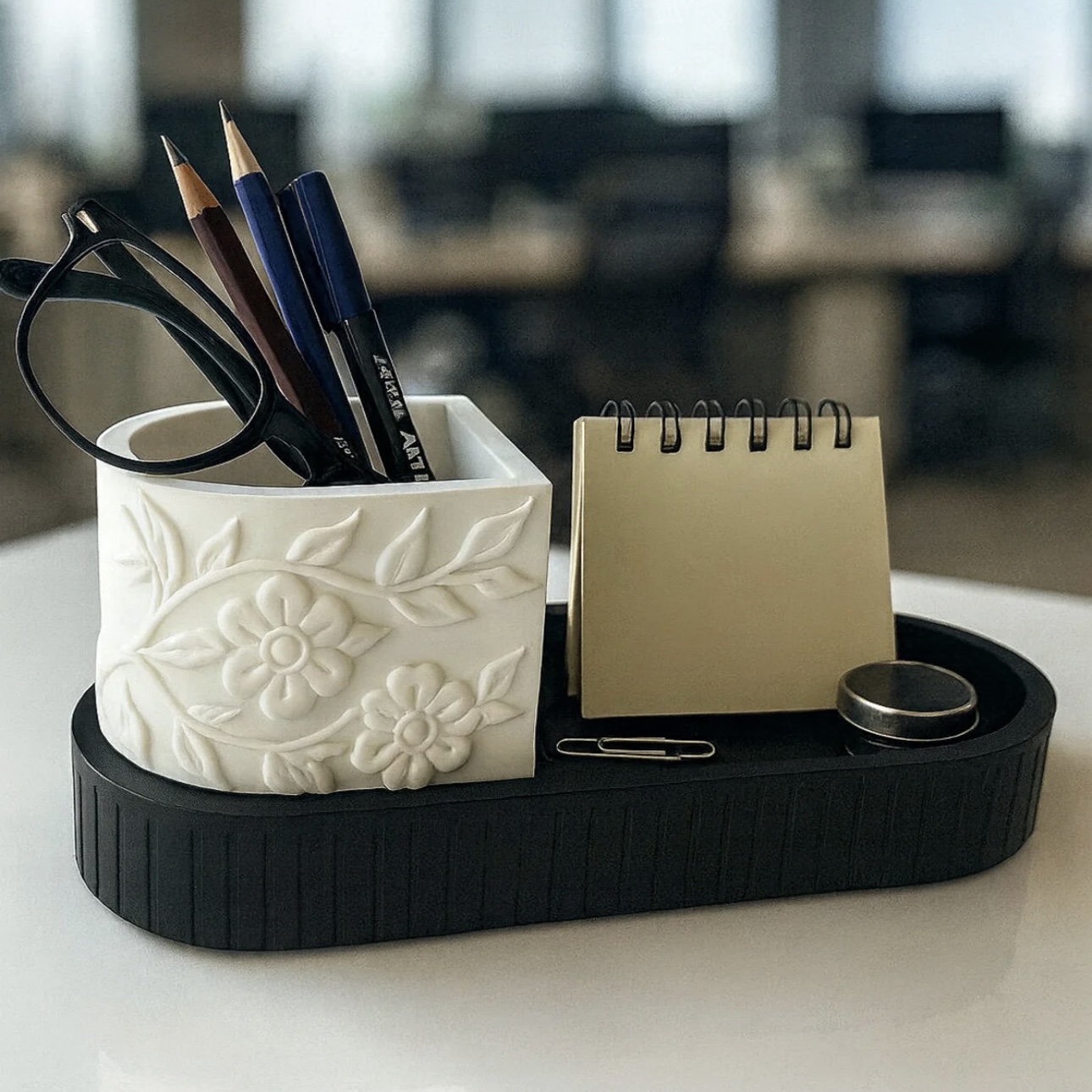 2 Bölmeli Dekoratif Masaüstü Organizatör – Kalemlik ve Küçük Eşya Tepsisi (Çiçek/Modern Desenli)