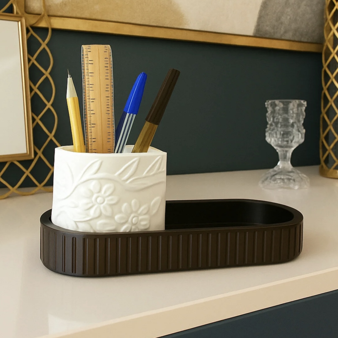 🌸 Estetik Tasarım: Setin kalemlik kısmı, zarif çiçek rölyefleri (veya dikey çizgili modern desen) ile bezenmiş beyaz veya krem tonlarında şık bir tasarıma sahiptir. Bu kısım, kahverengi veya siyah renkteki uzun ve çizgili tepsi ile kontrast oluşturarak modern bir görünüm sunar.