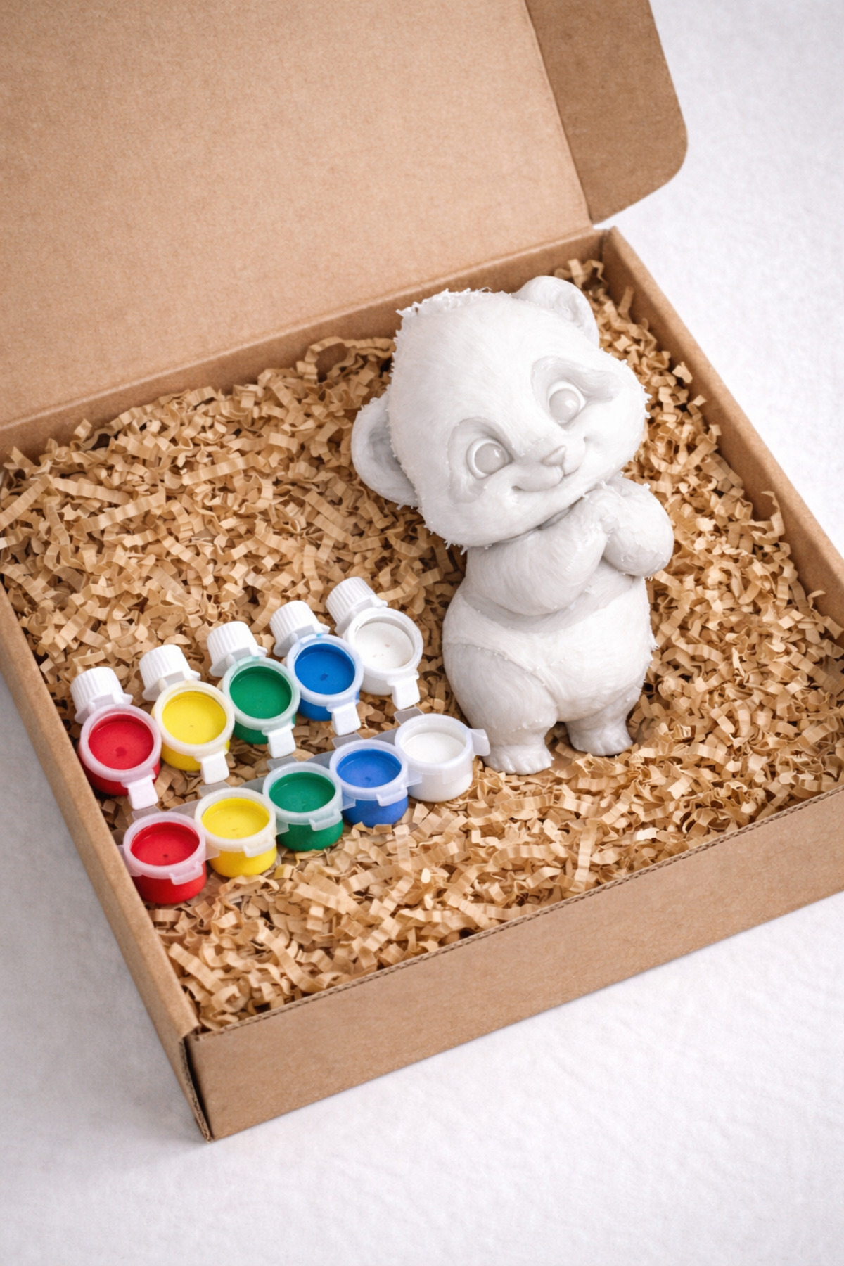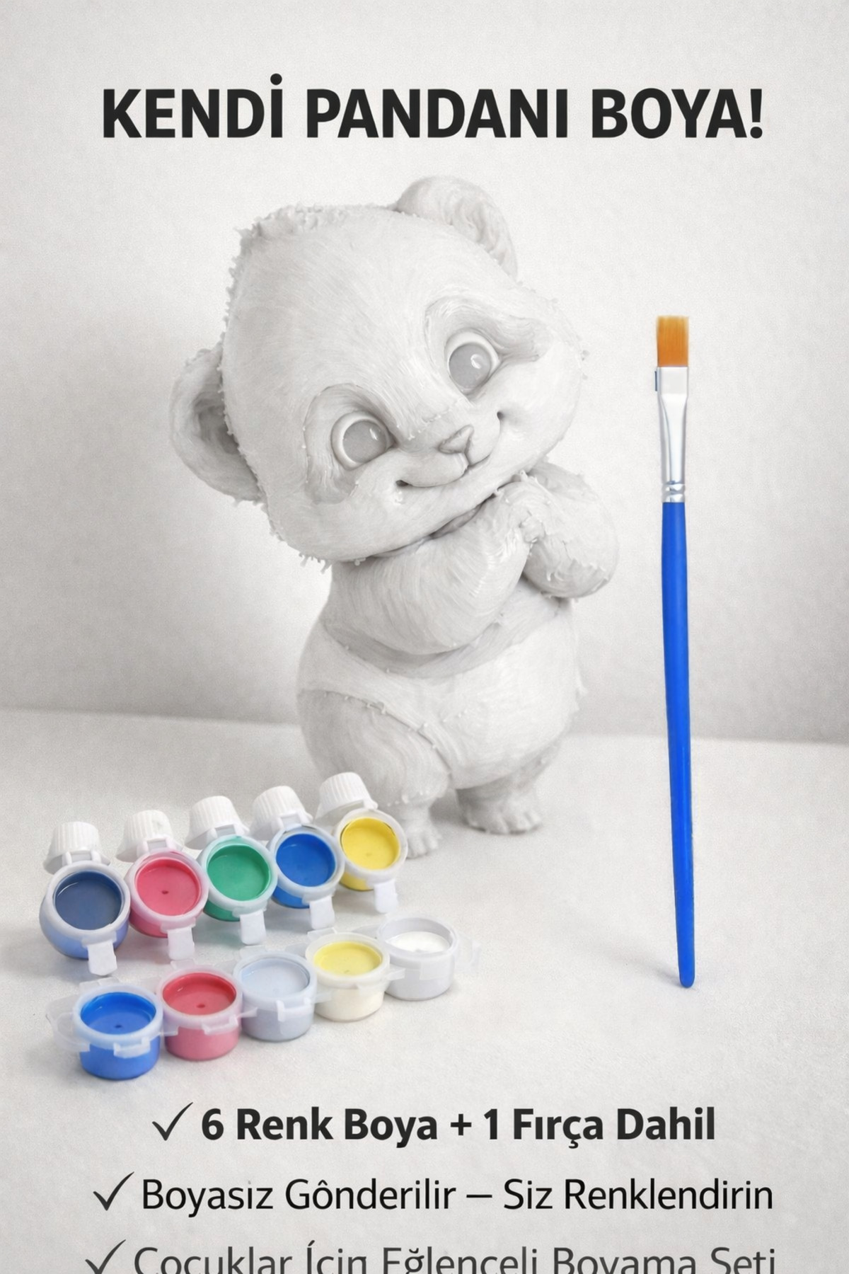 Sevimli Panda Boyama Seti – Boyasız Panda Figürü + 6 Renk Akrilik Boya & Fırça