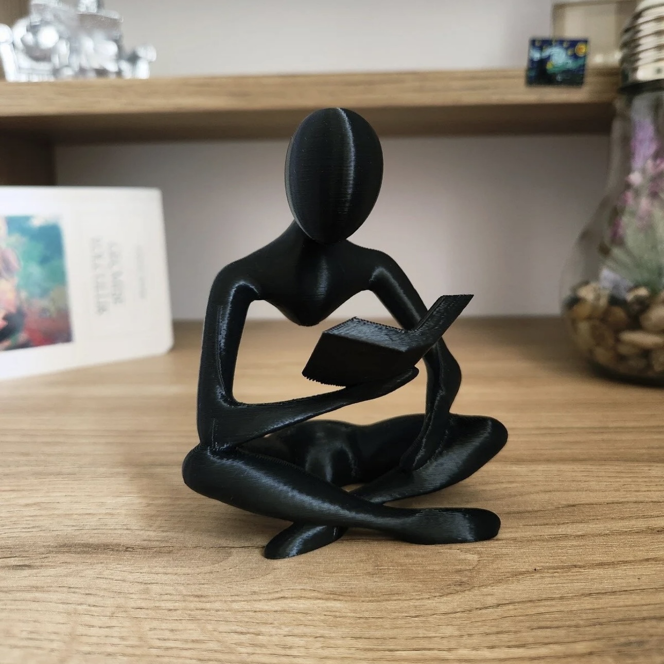 Okuma sevgisini ve derin düşünceyi temsil eden minimalist ve soyut bir sanat eseri. Oturmuş, bacak bacak üstüne atmış ve elindeki kitabı okuyan bu figür, sadeliği ve akıcı hatlarıyla modern bir estetik sunar. Siyah (veya koyu renk) tasarımıyla her türlü renkli ortama kolayca uyum sağlar. Kitaplıklar, çalışma masaları, komodinler veya oturma odası sehpaları için ideal bir dekoratif objedir. Okuma tutkunları, öğretmenler veya sade dekorasyonu sevenler için anlamlı bir hediye seçeneğidir.